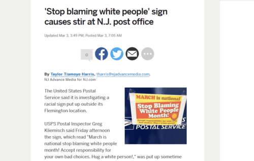 USPS Postal Inspector Greg Kliemisch said Friday afternoon the sign, which read “March is national stop blaming white people month! Accept responsibility for your own bad choices. Hug a white person!,” was put up sometime Thursday. It was taken down in the afternoon by employees, he said.