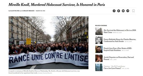 A couple of days ago, I posted “Reading the NEW YORK TIMES Upside Down” about how an NYT article on the reportedly anti-Semitic murder of 85 year old Jewish lady Mireille Knoll kept any hint about the identity of the murderers hidden until the 12th paragraph when it finally mentioned that the prime suspect was “North African” (i.e., Muslim)