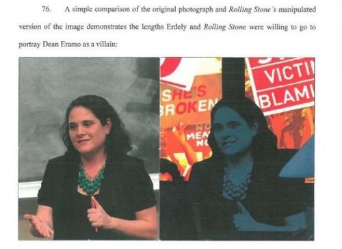 Left: Original photo of UVA’s Dean Eramo; Right, demonic Rolling Stoneized version accompanying Sabrina Rubin Erdely’s smear job