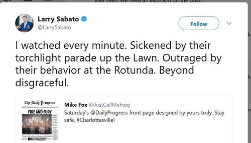 "In my 47 years of association with @UVA, this was the most nauseating thing I've ever seen. We need an exorcism on the Lawn," Larry Sabato, director of the University of Virginia Center for Politics tweeted.Charlottesville remains on edge ahead of 'Unite the Right' rally, by Nicole Chavez, CNN, Saturday, August 12 2017.