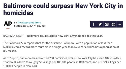Baltimore could surpass New York City in homicidesThe key moments in why Baltimore was swept under by the Obama Administration’s pet Black Lives Matter movement but New York City wasn’t came in late 2014 and early 2015.By The Associated Press