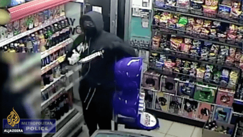 Below, a diverse London resident carries a substantial blade to rob a store.