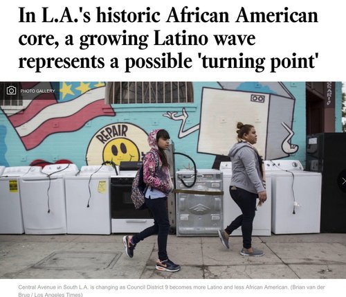 In L.A.’s historic African American core, a growing Latino wave represents a possible ‘turning point’, Los Angeles Times, February 28, 2017Few places hold as much importance in Los Angeles’ black history as Central Avenue, the birthplace of the West Coast jazz scene and a magnet for those leaving the South seeking a better life.