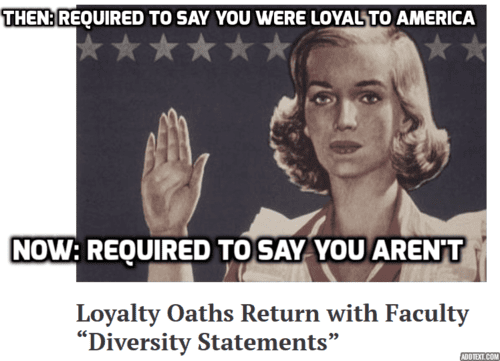 The ideological fervor for conformity abated for decades, but has recently returned on our college campuses in the form of mandatory “diversity statements” by faculty members and especially prospective faculty members. The difference is that instead of having to pledge adherence to America in its battle with communism, the new pledge is adherence to the “diversity” agenda in its battle against a color-blind, merit-driven academia.What is a "diversity statement"? It's a set of, in effect, political beliefs:This recent paper by the Oregon Association of Scholars illuminates the problem of mandatory diversity statements. While the paper focuses chiefly on schools in the Oregon higher education system, it observes that more than twenty major universities and systems across the nation now require diversity statements for hiring or promotion, including the University of California, Carnegie-Mellon University, and Virginia Tech.