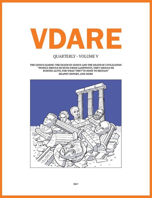 Attached, you'll find the digital version of Volume V of the VDARE Quarterly. As you know, VQ is a print journal featuring the best content we publish on our website, VDARE.com. It replaces our yearly anthologies, in an effort to get our best content out to our readers in the most effective, time-sensitive and aesthetic way possible.If you haven't yet subscribed to the VDARE Quarterly, our April Appeal would be a good time to start.I want to thank you for your patience with this volume. We suffered a number of setbacks within the last six months, the most significant being the abrupt suspension of our Paypal account that managed all VQ subscriptions. Production was much delayed, and I couldn't have done it at all without your support.