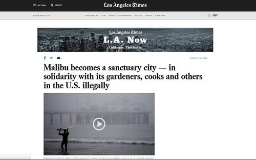 Malibu becomes a sanctuary city — in solidarity with its gardeners, cooks and others in the U.S. illegallyThe city’s “population” that doesn’t actually live in the city, to be precise. The city of Malibu possesses 21 miles of oceanfront, but the population has never been allowed to reach 13,000.The discussion inside Malibu City Hall over whether to become a sanctuary city last week bore the usual hallmarks of the heated national debate over illegal immigration.