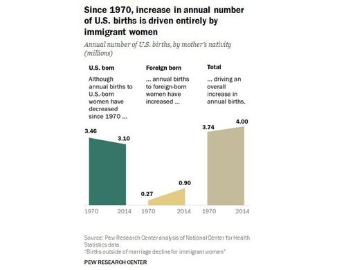 The rise in U.S births has largely been driven by immigrant women, and has been since 1970 — up to 4 million births in 2014 (or 23% of all babies), from 3.74 million in 1970, were to foreign-born moms, according to the Pew Research Center. Alternatively, the number of births by U.S.-born mothers has been declining, to 3.1 million births in 2014 from 3.46 million in 1970.This underlines the fact that all the lurch towards overpopulation in America is driven by immigrants – either directly by their arrival or indirectly by their breeding when here. The Pew Study cited above comments