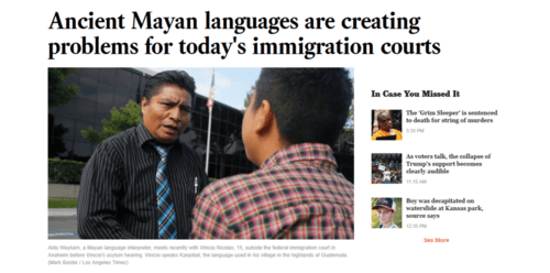 Wanted: Mayan indigenous language interpreters, Los Angeles Times, August 9, 2016The day Vinicio Nicolas found out whether he would be allowed to stay in the United States, and hopefully far from the gang trying to recruit him in Guatemala, he brought along an interpreter.