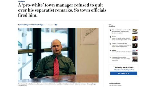 A ‘pro-white’ town manager refused to quit over his separatist remarks. So town officials fired him.NewAlbion.org is website with ideas about voluntary white separatism—something the citizens of Jackman, Maine have apparently already committed, they just object to having it named. See Voluntary Separation – An Honest Analysis, which says the same kinds of things that Michael Hart said in the book Restoring America, published by VDARE.com.by Marwa Eltagouri and Kristine Phillips, January 24, 2018