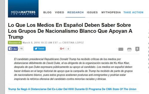Página Web De Odio Anti-Inmigración Llama A Trump "Indispensable".Speaking as simple Anglo-Saxon, I find all this foreign lingo very puzzling, not to mention inaccurate.La organización pro-derechos civiles Southern Poverty Law Center (conocida como SPLC) describe la página VDARE.com como "una página web de odio anti-inmigración" con una ideología de nacionalismo blanco que "con regularidad publica artículos de activistas prominentes del nacionalismo blanco, científicos de raza y anti-semitas". En un artículo de diciembre de 2015, el columnista de VDARE Patrick Cleburne enfatizó el plan de Trump de prohibir la entrada de musulmanes a los Estados Unidos, usando como encabezado "Donald Trump Está De Acuerdo Con VDARE.com: Alto A La Inmigración Musulmana!" agregando, "Una vez más — Donald Trump es indispensable". La página web luego uso la propuesta de Trump para pedir donativos, escribiendo: "Debido al improbable ascenso de Donald Trump ... nuestras ideas están ahora firmemente en el ideario común". [Traducido del Southern Poverty Law Center, visitado 7/3/16; y de VDARE.com, 7/12/15; 8/12/15]
