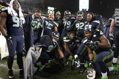 Whereas in 2014, we are so much better informed than Nixon, Moynihan, and Jensen were over 40 years ago. We've had 45 years of experience that proves them wrong, wrong, wrong. For example, here's a picture showing the many Asians who play on the 2014 Super Bowl-winning Seattle Seahawks defensive unit: