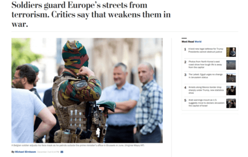 Brenda Walker’s December 5, 2017 article Europe: Troops Battle Burnout as Well as Muslim Mass Murderers discusses yet another drawback of mass Muslim migration, that is, the need to use regular soldiers in the role of police, to quell Muslim attacks. But the troops are not being used to fight terror: when the police make precision raids on extremist hideouts, they are fighting terror; when a nation deploys thousands of troops to protect citizens from a violent minority, it is fighting an insurgency. [Soldiers guard Europe’s streets from terrorism. Critics say that weakens them in war. MSN, December 4, 201]