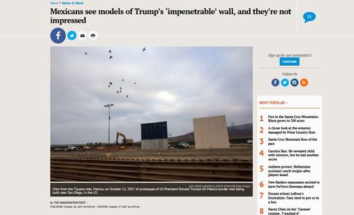 Mexicans see models of Trump’s ‘impenetrable’ wall, and they’re not impressed, San Jose Mercury, October 16, 2017(Washington Post) SAN DIEGO — The prototypes of the Trump border wall are taking shape this month in a sun-baked swath of scrubland abutting a run-down neighborhood of Tijuana. Lined up next to each other, the 30-foot-tall concrete and steel sample barriers – some with extra-stout reinforced bases, others topped with metal spikes – certainly look ominous.