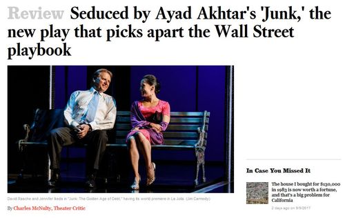 In “Junk: The Golden Age of Debt,” his thrilling new play, which is receiving its world premiere here at La Jolla Playhouse, Akhtar takes on the equally explosive subjects of modern finance and the new religion of money. …