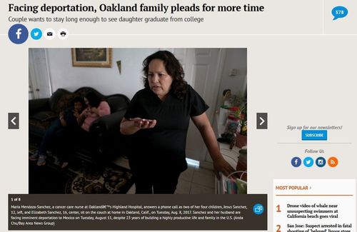 Deportation order splits Oakland family and highlights shift under Trump, San Francisco Chronicle, August 9, 2017Although President Trump ran on a platform of rounding up and deporting “bad hombres,” Oakland nurse Maria Mendoza-Sanchez knew that she and her husband — who each lack legal status — would not be protected by their clean records.