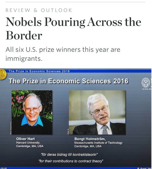 Nobels Pouring Across The BorderThis was too much even for WSJ readers: the comment thread is almost uniformly hostile.All six U.S. prize winners this year are immigrants