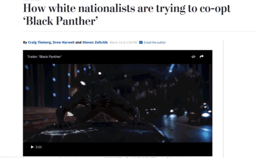 Researchers said the episode seemed to mark a turn for white nationalists online. Instead of avoiding a cultural phenomenon that conflicts with their ideology, they have sought to subvert and transform it in hopes of recruiting followers and normalizing their views on white supremacy. The misinformation campaign also shows how such groups are increasingly propagating disinformation, by morphing breaking news and cultural touchstones into staging grounds for hateful ideologies and racist ideas.[Comment at Unz.com]Malkia Cyril, the executive director of the Center for Media Justice, an Oakland-based nonprofit group, said, “The claim that the Black Panther hero, King T’Challa, represents the core beliefs of the alt right — isolationism, anti-globalism and racial homogeneity — is preposterous, and can only be asserted by white supremacists or people who really don’t understand the relationship between Africans in the diaspora and on the continent.” …