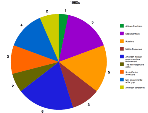 Clint Eastwood, Tom Cruise, Bruce Willis, Steven Seagal, Sylvester Stallone, Arnold Schwarzenegger, Harrison Ford, Wesley Snipes, Mel Gibson and James Bond (he may not be real, but he’s definitely an action hero). I looked into each of their films (most of which I have not seen) and deciphered the villains’ ethnicities/races/affiliations. (I hope I did this all correctly but in some of the lesser-known films it was hard to tell so let me know if you find errors!) I discarded categories with only one or two entries: deranged wives (“Presumed Innocent”), clones (“Blade Runner”), the IRA (“The Devil’s Own”) [VDARE.com note: These are all white people, since they're related to, married to, or clones of Harrison Ford.] and split the rest into ten categories: African-Americans (light green on the graphs below), Nazis/Germans (purple), Russians (light orange), Middle Easterners (red), American military/government/law enforcement (dark blue), the mob/organized crime (brown), South/Central Americans (dark orange), North-East Asians (dark green), non-governmental white guys (light blue), and American companies (yellow)