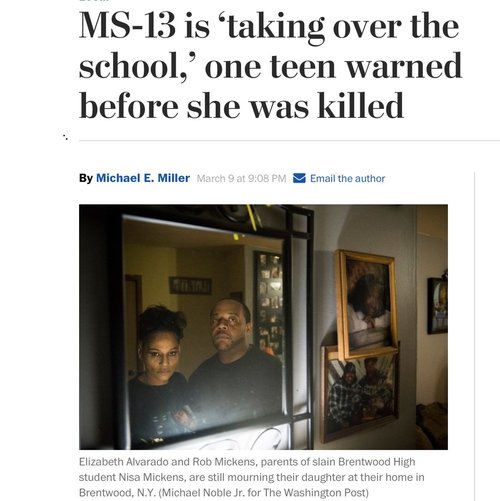 From New York to Virginia to Texas, schools in areas racked by MS-13 violence are now struggling with a sobering question. What to do when the gang isn’t just in your community, but in your classrooms?[MS-13 is 'taking over the school," one teen warned before she was killed, by Michael Miller, March 9, 2018]
