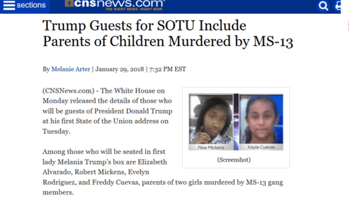 Trump Guests for SOTU Include Parents of Children Murdered by MS-13, CNS News, January 29, 2018(CNSNews.com) – The White House on Monday released the details of those who will be guests of President Donald Trump at his first State of the Union address on Tuesday. Among those who will be seated in first lady Melania Trump’s box are Elizabeth Alvarado, Robert Mickens, Evelyn Rodriguez, and Freddy Cuevas, parents of two girls murdered by MS-13 gang members.