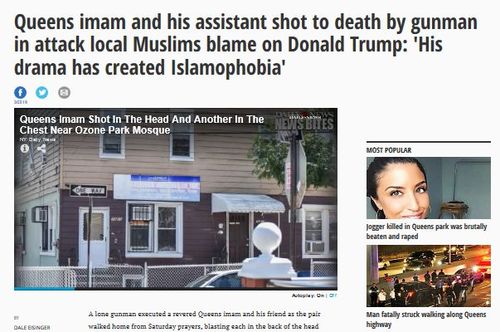 Queens imam and his assistant shot to death by gunman in attack local Muslims blame on Donald Trump: ‘His drama has created Islamophobia’Eventually, the article finally gets around to describing the suspect:Updated: Saturday, August 13, 2016, 11:27 PM