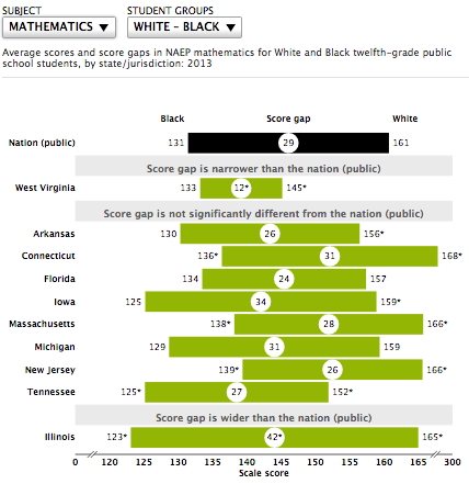Above is a graph of the ten states where the NAEP had big enough sample sizes to break out The Gap (white-black, in this graph on the Math test). Of the ten states, the only one where The Gap is notably smaller than in the nation at large is West Virginia. How has West Virginia accomplished this goal that has obsessed policymakers and pundits for most of my lifetime? By having many of the smart white people in West Virginia move to greener pastures in North Carolina, Virginia, Georgia, and so forth.