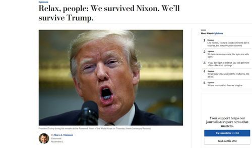 Here is the headline: “Relax, people: We survived Nixon. We’ll survive Trump.”