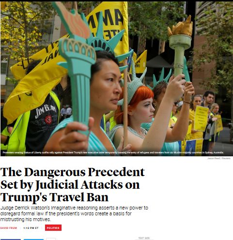 In the Atlantic, Frum has a column called The Dangerous Precedent Set by Judicial Attacks on Trump's Travel Ban | Judge Derrick Watson’s imaginative reasoning asserts a new power to disregard formal law if the president’s words create a basis for mistrusting his motives, March 16, 2017