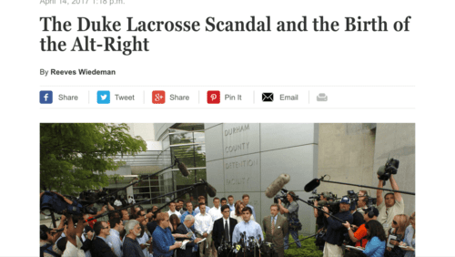 The Duke Lacrosse Scandal and the Birth of the Alt-RightIt’s mostly devoted to trying to tie Stephen Miller to Richard Spencer, who were both at Duke U. during that hoax that so exemplified what Tom Wolfe had called two decades before in The Bonfire of the Vanities the “mania for the Great White Defendant.”April 14, 2017 1:18 p.m.