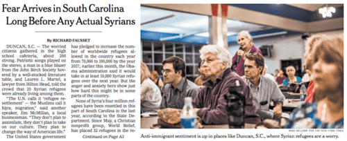Refugee Crisis in Syria Raises Fears in South Carolina New York Times, By Richard Fausset, September 25, 2015DUNCAN, S.C. — The worried citizens gathered in the high school cafeteria, about 200 strong. Patriotic songs played on the stereo, a man in a blue blazer from the John Birch Society hovered by a well-stocked literature table, and Lauren L. Martel, a lawyer from Hilton Head, told the crowd that 25 Syrian refugees were already living among them.