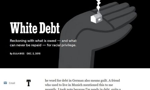 White Debt Reckoning with what is owed — and what can never be repaid — for racial privilege.This mantra — “White people are no more closely related to one another, genetically, than we are to black people” — is one of the most common urban legends of the 21st Century even though it’s obviously stupid. (It seems like I used to know where this myth originated, but I’ve forgotten.)By EULA BISS DEC. 2, 2015