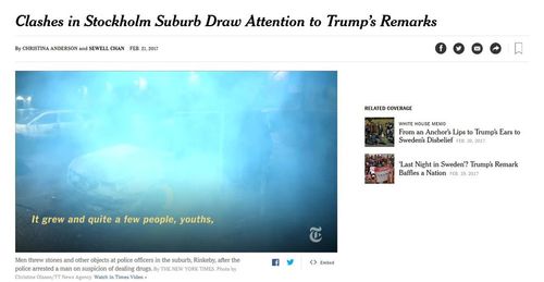 Swedish officials have criticized his statements as exaggerations. Preliminary statistics do not show a major increase in crime from 2015, when the country processed a record 163,000 asylum applications, to 2016. Riots like the one in Rinkeby, officials said, are not unprecedented but are infrequent.The Times’s link goes to an untranslated document, so we have to take the Times at its word that the data do not show a “major increase.” And what is a “major increase?” Who decides that?