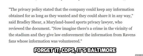 “The privacy policy stated that the company could keep any information obtained for as long as they wanted and they could share it in any way,” said Bradley Shear [Email him] a Maryland-based sports privacy lawyer, who reviewed the document. “Now imagine there’s a crime in the vicinity of the stadium and they give law enforcement the information from Ravens fans whose information was volunteered.”