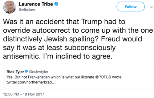 Harvard Law School professor Laurence Tribe, who was always being mentioned in the 1980s as the Democrats’ next Supreme Court nominee, has an amusingly demented Twitter account these days. Today, Tribe intuits the anti-Semitic conspiracy behind a Trump misspelling in a Tweet: