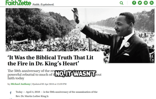 Along with the hooey that Martin Luther King would be conservative if he were alive we also get the hooey that King was a Christian.