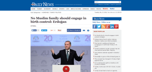 “I am saying this clearly, we will increase our posterity and reproduce generations. As for population planning or birth control, no Muslim family can engage in such a mentality. We will follow the road that my God and dear Prophet [Muhammad] say,” Erdoğan said in an address to the foundation of the Service for Youth and Education Foundation of Turkey (TÜRGEV) in Istanbul.