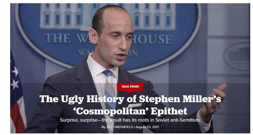To be clear: Steve Bannon and Stephen Miller would angrily wave away any suggestion that they are echoing the sentiments of anti-democratic political movements, much less anti-Semitic dog whistles. But there is no evading the unhappy reality that to label someone a “cosmopolitan” carries with it a clear implication that there is something less patriotic, less loyal … someone who is not a “real American.”Perhaps Greenfield knows this, or perhaps he doesn’t, but Miller is Jewish.