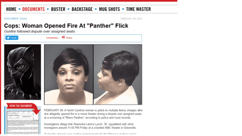 A North Carolina woman is jailed on multiple felony charges after she allegedly opened fire in a movie theater during a dispute over assigned seats at a screening of “Black Panther,” according to police and court records.Hmmm. Gunfire during a squabble about a theater seat? Shameka Latrice Lynch? I wonder. What might that suspect look like?Investigators allege that Shameka Latrice Lynch, 30, squabbled with other moviegoers around 11:45 PM Friday at a crowded AMC theater in Greenville.