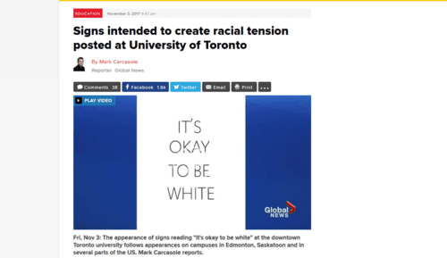 The signs reading “it’s okay to be white,” may be offensive to some, but that would be playing right into the hands of those responsible. It’s part of an online gag aimed specifically at raising racial tensions.