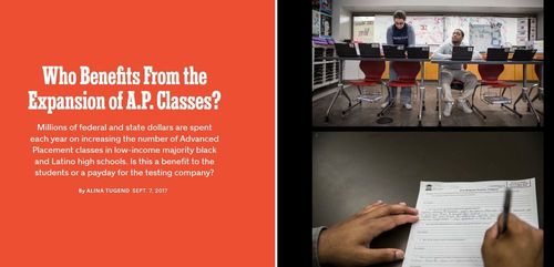 Who Benefits From the Expansion of A.P. Classes?Advanced Placement tests for high school students are scored as if they were an intro 101 level course at a run-of-the-mill Directional State College. A 3 is equivalent to a C, 4 is a B, a 5 is an A. Many colleges give course credit for scores of 3 or higher, although some are toughening up. Last time I checked, MIT didn’t accept any scores below 5 and Caltech didn’t accept any AP scores at all on the grounds that none of their courses are 101 level.Millions of federal and state dollars are spent each year on increasing the number of Advanced Placement classes in low-income majority black and Latino high schools. Is this a benefit to the students or a payday for the testing company?