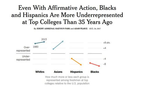 Even With Affirmative Action, Blacks and Hispanics Are More Underrepresented at Top Colleges Than 35 Years Ago- It’s almost as if 45 to 50 years of affirmative action haven’t succeeded in making blacks and Hispanics smarter …By JEREMY ASHKENAS, HAEYOUN PARK and ADAM PEARCE AUG. 24, 2017