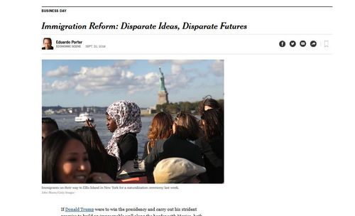Immigration Reform: Disparate Ideas, Disparate FuturesI know we aren’t supposed to use analogies when thinking about immigration policy, because analogies are conducive to rational thought, while immigration policy is supposed to be decided based solely upon schmaltz. Still, immigration policy can be compared to college admissions policies. Trump says America should have an Ivy League admissions policy, while Hillary says America deserves a community college admissions policy.By Eduardo Porter