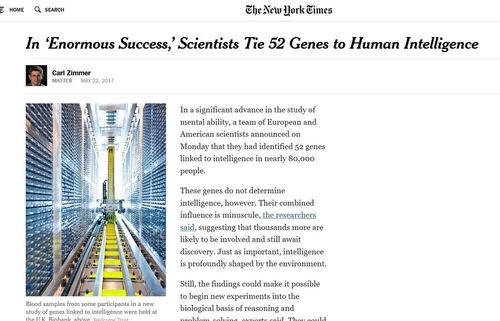 In ‘Enormous Success,’ Scientists Tie 52 Genes to Human IntelligencePaige Harden was a co-author of the Vox “Junk Science” article last week about how Charles Murray is 80% right and his critics 80% wrong, but the know-nothings are still on the side of the angels.Carl Zimmer