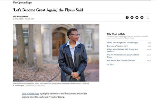 ‘Let’s Become Great Again,’ the Flyers Said This Week in Hate By ANNA NORTH FEB. 16, 2017Valerie Grim discovered flyers from a white nationalist group posted outside her office at Indiana University in Bloomington.