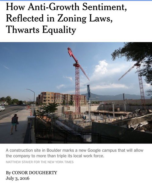 [How Anti-Growth Sentiment, Reflected in Zoning Laws, Thwarts Equality, by Conor Dougherty, July 3, 2016]