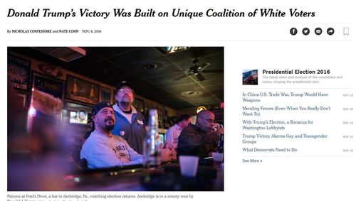 Donald Trump’s Victory Was Built on Unique Coalition of White VotersBy NICHOLAS CONFESSORE and NATE COHN NOV. 9, 2016