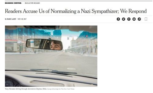 Some readers did see value in the piece. Shane Bauer, a senior reporter at Mother Jones and a winner of the National Magazine Award, tweeted: “People mad about this article want to believe that Nazis are monsters we cannot relate to. White supremacists are normal ass white people and it’s been that way in America since 1776. We will continue to be in trouble till we understand that.” …
