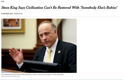 Steve King Says Civilization Can’t Be Restored With ‘Somebody Else’s Babies’ By MATTHEW HAAG MARCH 12, 2017Can't load tweet https://twitter.com/SteveKingIA/status/840980755236999169: Unknown MIME type: text/htmlOn Twitter, Representative Steve King, Republican of Iowa, echoed the principles of white nationalism.