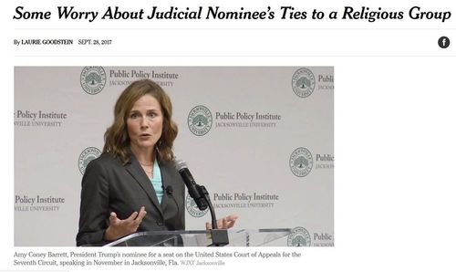 Some Worry About Judicial Nominee’s Ties to a Religious GroupObviously, Senator Feinstein’s concerns about Professor Barrett’s biases are completely different from even any hypothetical skepticism about long-time U.S. State Department honcho Dennis Ross’s unquestionable right to serve as “Israel’s lawyer” during Middle Eastern negotiations at American taxpayers’ expense.By LAURIE GOODSTEIN SEPT. 28, 2017