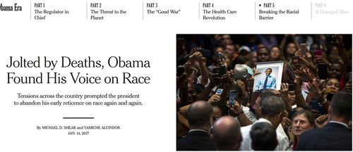 Jolted by Deaths, Obama Found His Voice on RaceOf course, there’s no mention in the NYT of the incremental 6,624 homicide victims during Obama’s racially outspoken post-Ferguson last two years in power.Tensions across the country prompted the president to abandon his early reticence on race again and again.